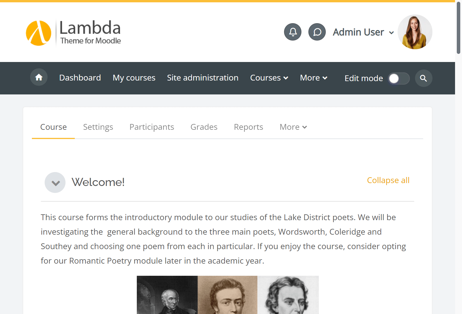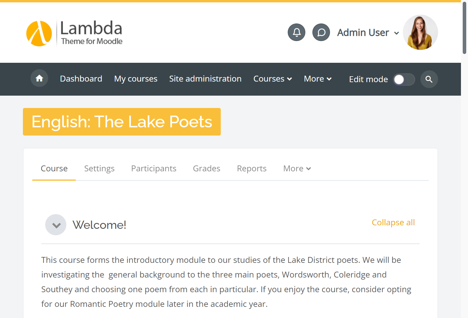 - That's it. As a member of the newly created cohort, you can now work with Lambda 2 as the active theme while all other users will still view your Moodle site with the default theme.